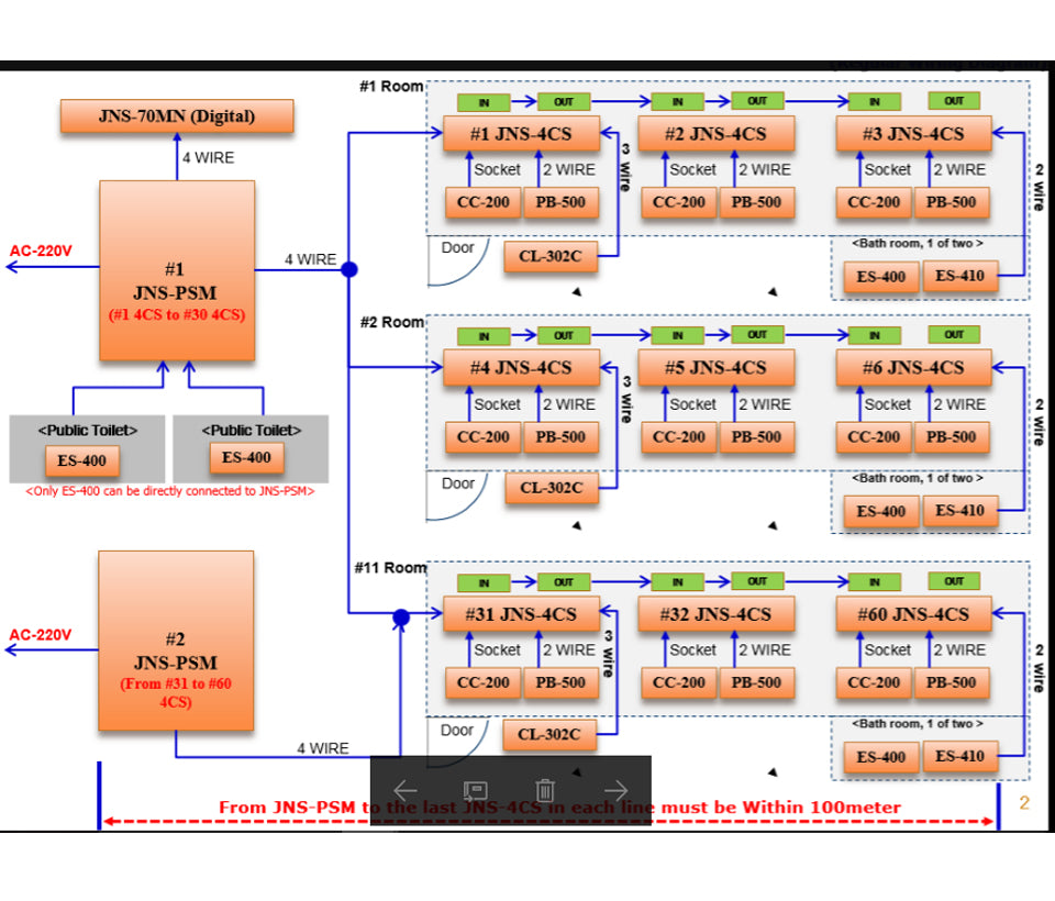 - Conexión directa en la PCB de la unidad: Tiene los modelos grabados de cada terminal para asegurar que los cables se conecten correctamente. Los equipos JNS4CS (subestaciones de cama) y JNS70MN (unidad de intercomunicación) se conectan directamente a sus bornes correspondientes en la unidad central lo que facilita la instalación reduce errores y garantiza un funcionamiento seguro y eficiente.