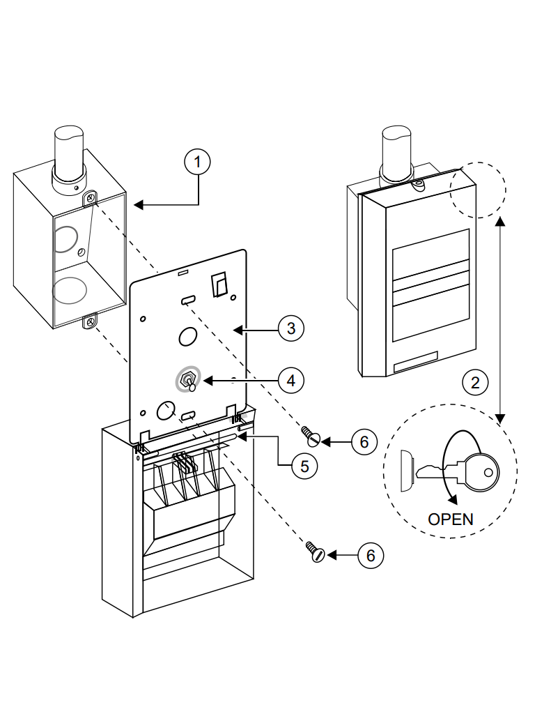 Monte en una caja norteamericana de 2-1/2 pulg. (64 mm) de profundidad de 1 salida o en una caja cuadrada estándar de 4 pulgadas y 1-1/2 pulg. (38 mm) de profundidad con 1 cubierta de salida.
