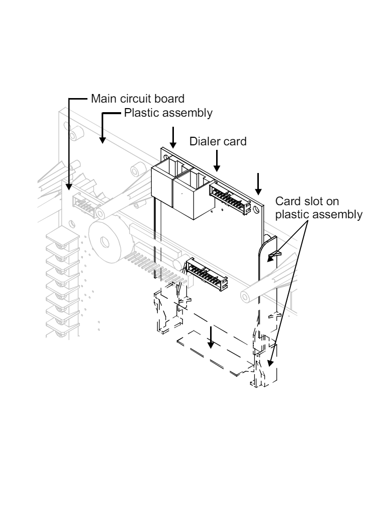 - Coloque la ranura de la tarjeta del DACT sobre el montaje plástico detrás del tablero del circuito principal y del conector J8 del tablero del circuito principal (en la parte central superior del tablero principal).
